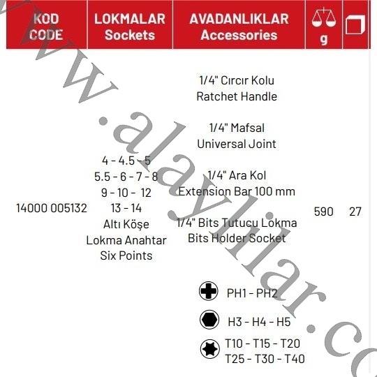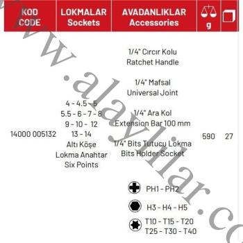 1/4” Altı Köşe Lokma Anahtar ve Bits Set (27 parça, mm)