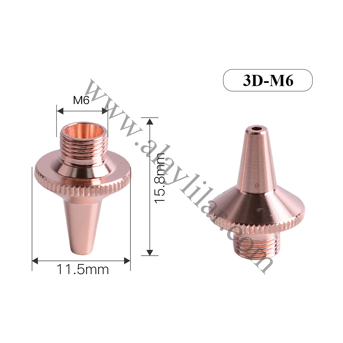 M6 Laser Cutting Nozzle, yüksek kaliteli bakır alaşımdan üretilmiş, fiber lazer kesim makinelerinde optimum gaz akışı ve kesim hassasiyeti sağlayan OEM yedek parçadır.