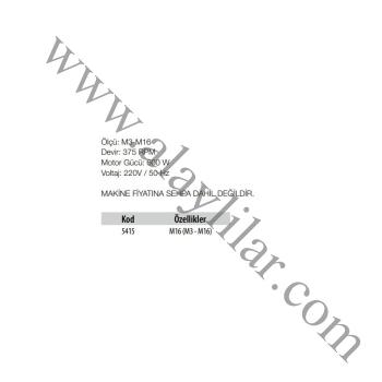 Ölçü: M3-M16 Devir: 375 RPM Motor Gücü: 600 W Voltaj: 220V / 50 Hz MAKİNE FİYATINA SEHPA DAHİL DEĞİLDİR.